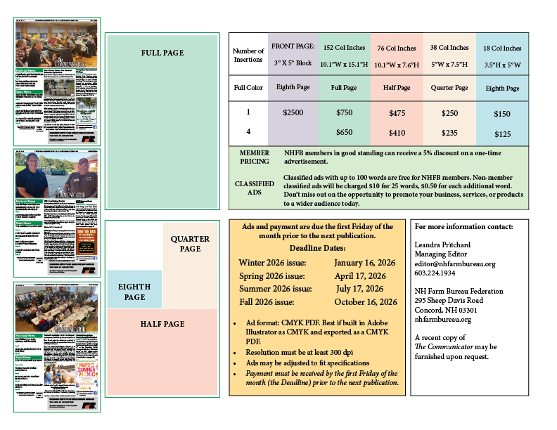 The reach and credibility of The Communicator make it an ideal platform for businesses and organizations looking to connect with a diverse audience passionate about rural life and agriculture. Seize the opportunity to elevate your brand and contribute to the vibrant community that NHFB fosters. Join us in our mission to support and advocate for New Hampshire’s farmers by advertising in The Communicator today!